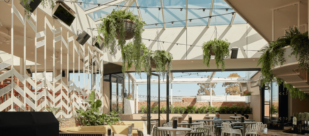 Enjoy restaurant-style seating in an ornate art-deco setting. Situated upstairs, this indoor space is open for bookings Thursday to Sunday for lunch and dinner.
